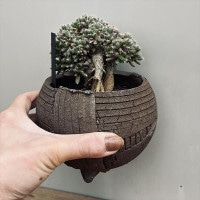 塊根部分がしっかりと太り、まるで大樹のように見える盆栽仕立てで、丸い陶器鉢によく似合ってかっこいいです。