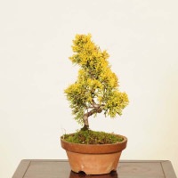 常緑樹。幹も雰囲気があります。葉先が黄色く変色する変わり種品種です。今は素焼き鉢なので見ごたえが分かりにくいですが、 お好みの盆栽鉢に植えてもらうと、かっこよくなります。