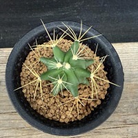 青みがかった球体から黄色い刺をいかつく生やす王冠竜の実生です。まだまだ小さい赤ちゃん苗ですが、成長とともに刺が金色に立派に育ちます。