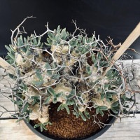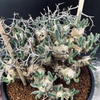 パリパリと皮がめくれかかったごつごつした幹から、細い緑色の葉と、絡み合ってもじゃもじゃとした針金のような花柄をつけるユニークな姿のチレコドン レティキュラーツス。