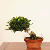 初夏に白い花が咲き、そこに実をつけます。古味を帯び、ずっしり太くくねった幹が魅力です。 今は鉢なので見ごたえが分かりにくいですが、 お好みの盆栽鉢に植えてもらうと、かっこよくなります。