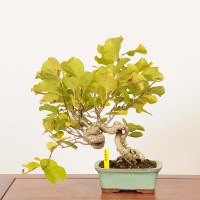 落葉樹。春に小さな花が咲き、そこに実をつけます。秋が深まると、実が黄色く色づきとても風情があります。くねった幹が魅力です。