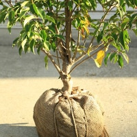 まず、深さ50-60cm、幅は植える大きさの2-3倍ほど掘ります。土が固すぎる、もしくは砂地である場合は、腐葉土やバークを1割ほど混ぜておく。根巻きの場合はビニール紐は取り除きますが、巻いている布のようなものは腐るものですので、そのままつけて植えます。杭に固定するとよいです。植えた直後にしっかり、たっぷりとお水をあげます。特に晩春から秋ごろは植え付け後1ヶ月は鉢植えと同じように乾き具合を見て、乾いていたら毎日でも水遣りをします。